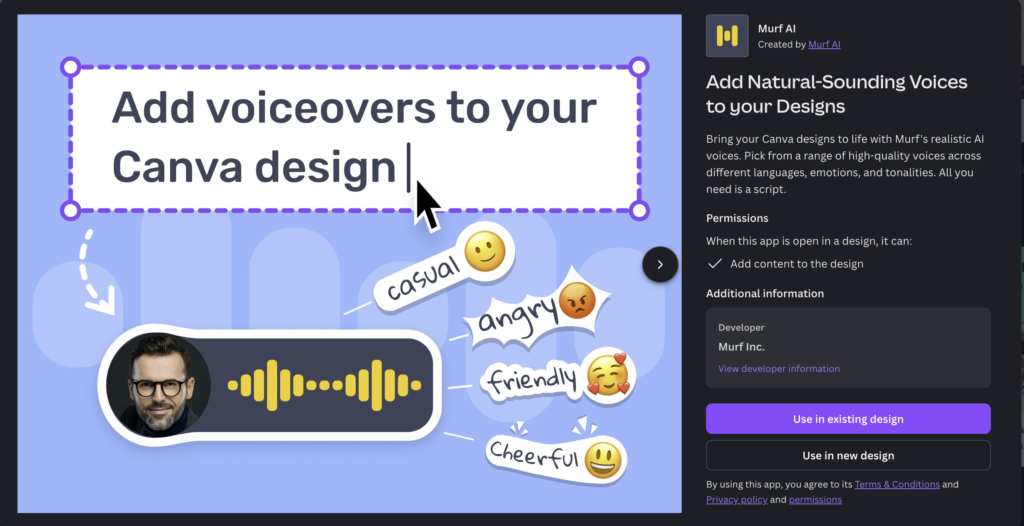 Murf AI is now an app within Canva, allowing you to create voice-overs directly in your Canva designs. This could be especially useful for creating quick-turn social media and marketing campaigns — especially for multi-lingual ads and social media posts.